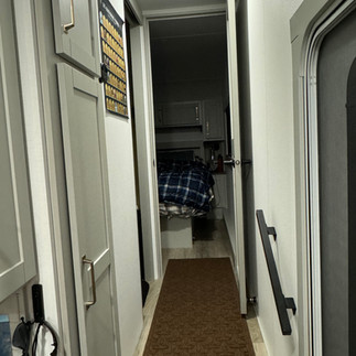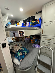 The closet by the main door is perfect for coats and shoes. The bathroom is great as far as RV bathrooms go. The shower is plenty big. The toilet is fine, though we changed out the toilet seat based on recommendations online. We never actually tested the original toilet seat. There is plenty of storage. We added a bunch of command hooks in the shower to hang Jordan's inflatable tub and any wet bathing suits. In the future, we won't need the diaper pail and changing table in there, which will be nice. Those were the only things we really had to move each travel day, except for locking the shower door and putting away the hand soap. We decided to keep our dirty laundry under half of the sink and that worked well, until the bag filled and it got moved under our bed or on the top bunk while another bag filled.